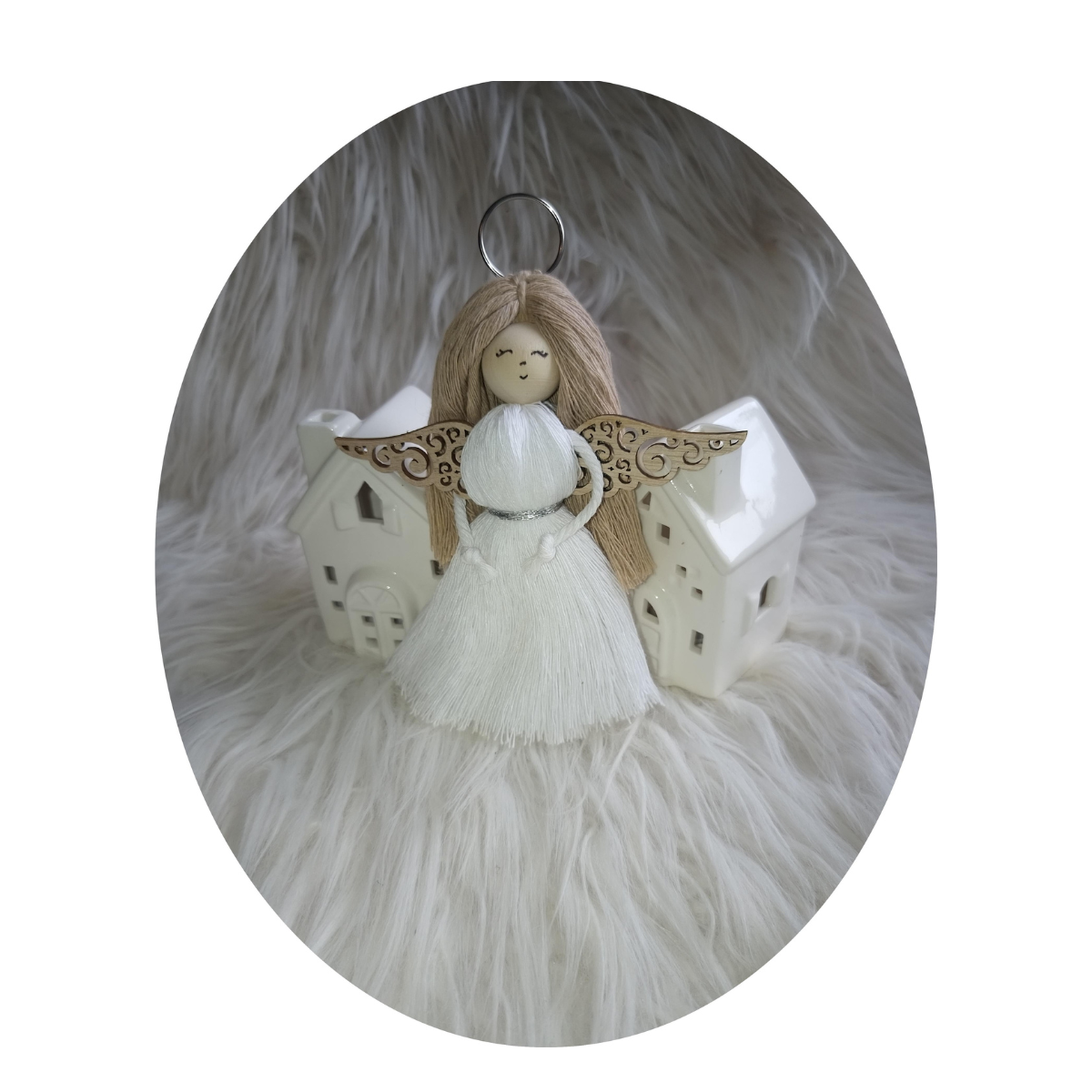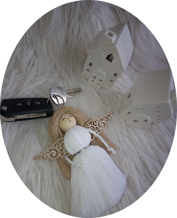 Ovaj preslatki makrame anđeo ručno je izrađen od prirodnih materijala i zrači toplinom. Namijenjen je kao privjesak za ključeve od auta, kuće, torbice ili ruksake te simbolizira sreću, zaštitu i dobre želje .
