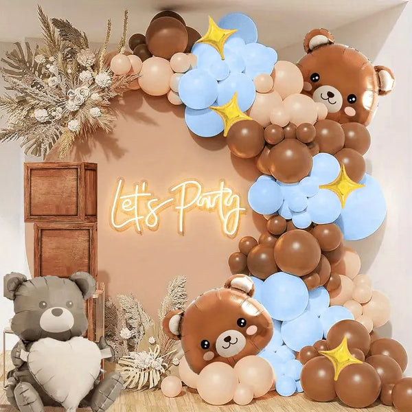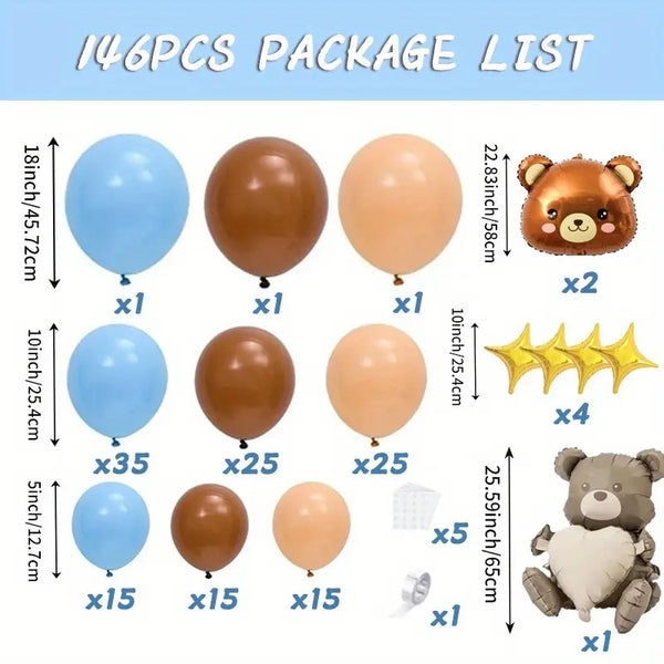 Set od 146 balona s temom medvjeda, plavo-smeđi lateks baloni, zlatna četverokraka zvijezda i baloni od aluminijske folije u obliku medvjeda, pogodni za ukrašavanje rođendana.