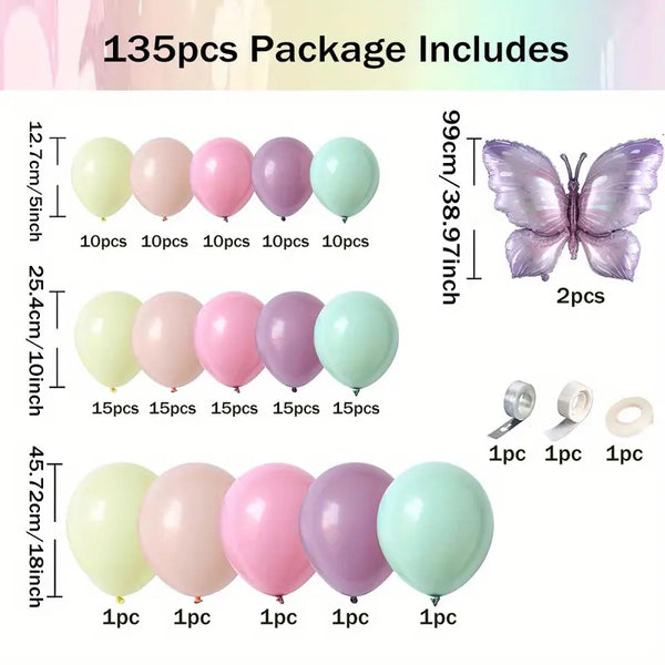 Set od 135 ljubičastih balona s motivom leptira za dekoraciju.